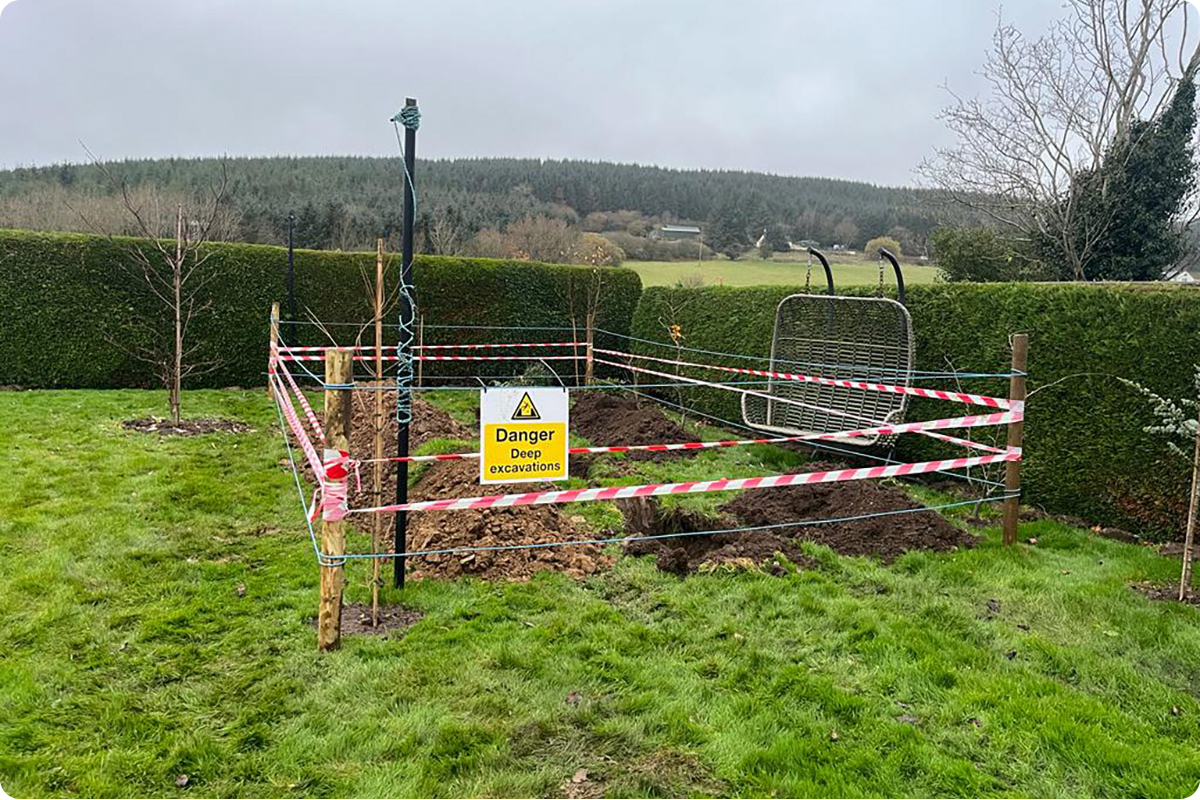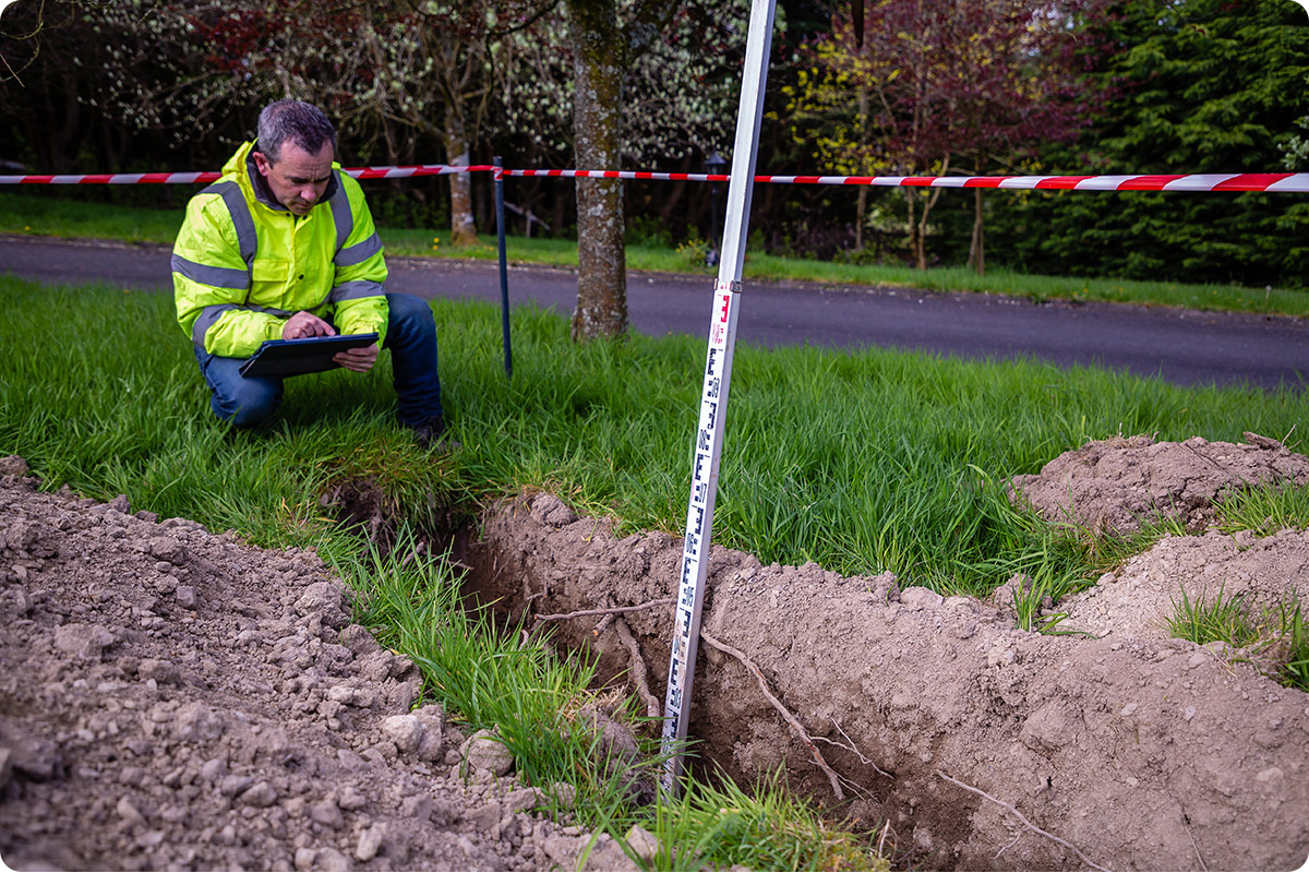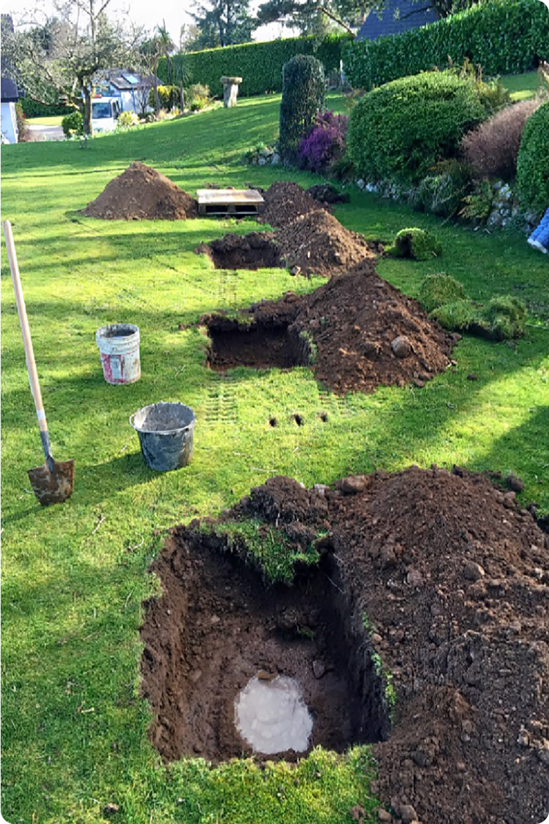 - Digging Test Holes – Several test holes are dug in the chosen area, typically 300mm–700mm deep and around 300mm square. The number of holes depends on the size of the drainage field.